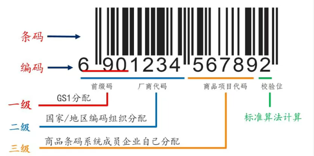 · “690” 为前缀码,由国际物品编码组织(GS1)分配,分配给我国的码段为690-699。近年来,GS1向我国授予新码段680-689,新码段可以保证我国未来50年的用码需求;