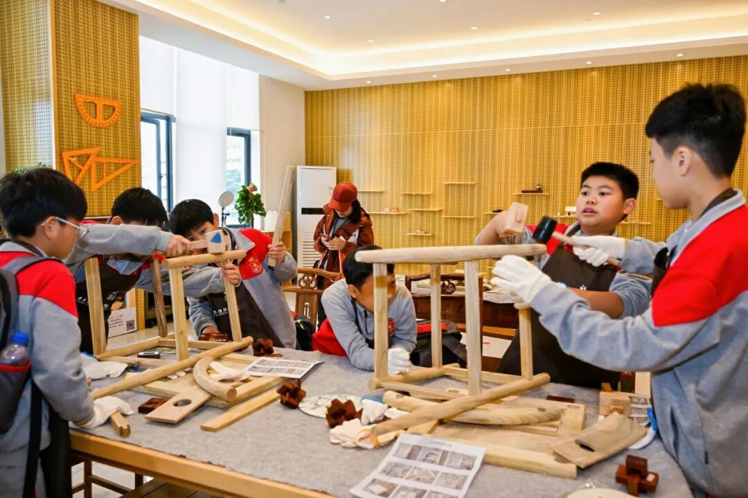 “对准榫头,轻轻推 —— 对了!” 在榫卯月牙椅体验区,博物馆老师手把手指导学子拼装。分组协作中,学子们不仅掌握了“面与面拼接”“点与点咬合” 的榫卯逻辑,更在分工配合里学会了团队协作。