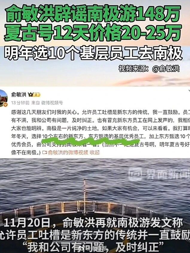 舆论发酵后,有媒体透露俞敏洪的南极邮轮行程费用高达148万元。对此,俞敏洪公开回应,否认了这一说法,称自己乘坐的是“夏古号”破冰船,12天行程的价格在20万-25万元之间,而非外界传言的148万元。