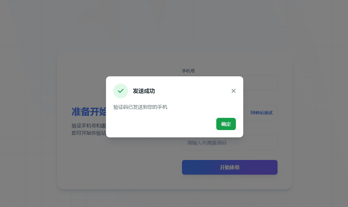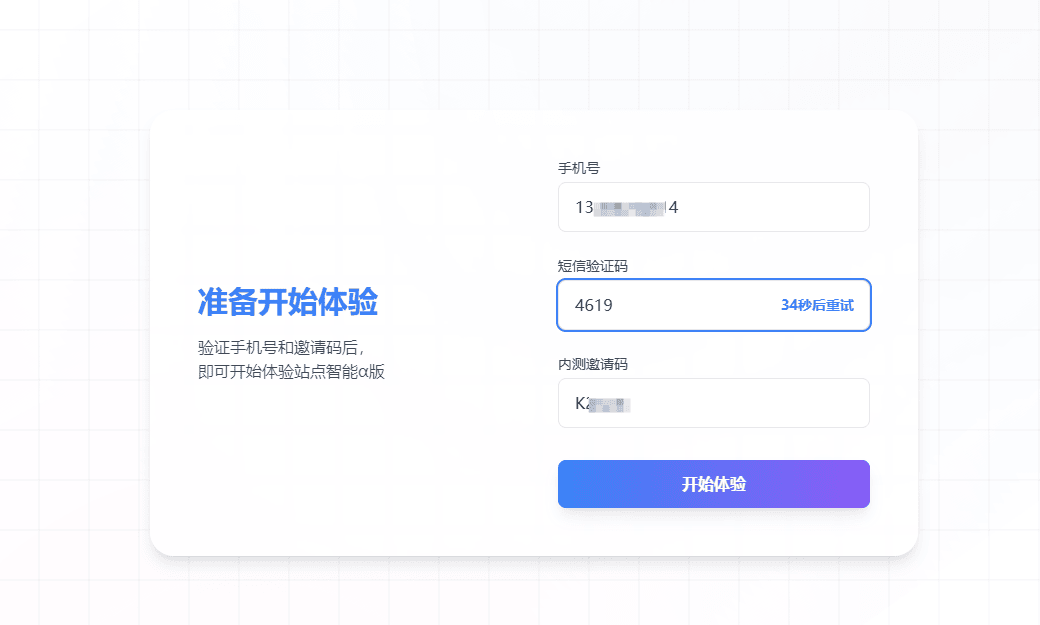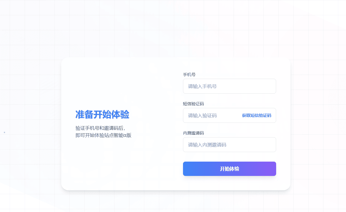 1、 打开 Alpha 内测版链接(https://www.zhandian.vip/a)→ 输入手机号→ 点击 “获取短信验证码”→ 输入验证码 + 内测邀请码→ 点击 “开始体验”,如下图所示: