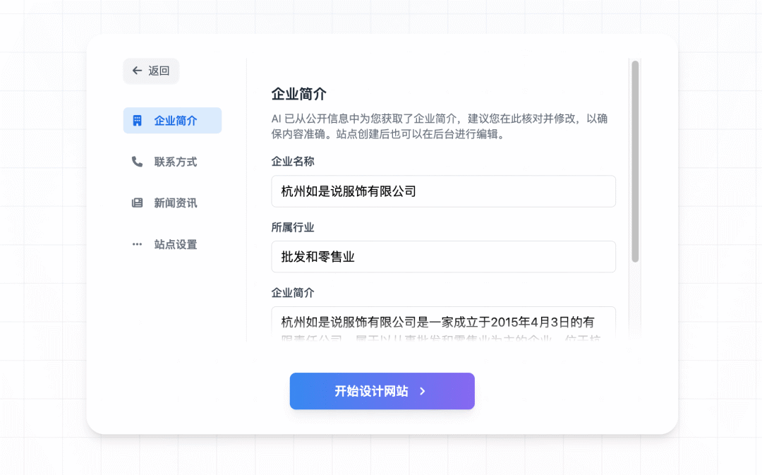 在提示框输入企业名称→ 点击 “开始 AI 搭建”,名称格式建议使用完整企业全称(如 “杭州如是说服饰有限公司 ”),避免简称,确保 AI 准确抓取工商信息(注册资本、经营范围等)