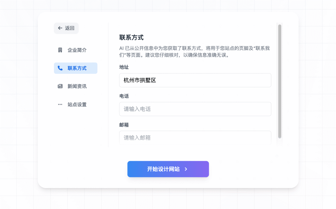 默认展示 AI 抓取的地址(如 “杭州市拱墅区”),手动补充企业联系电话、邮箱(将用于站点页脚及 “联系我们” 页面);