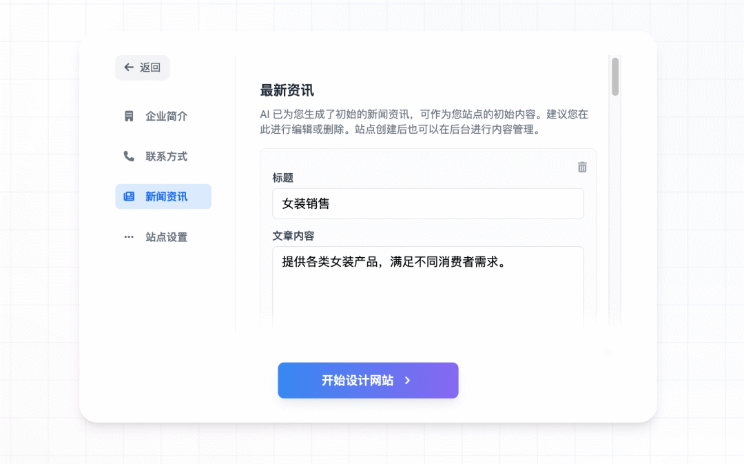 创建前信息编辑校正,AI 抓取公开信息后,可在站点搭建前直接修改企业简介、联系方式、新闻资讯等内容,避免部署后重复调整;