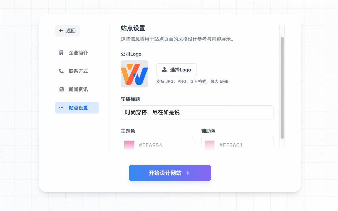 若 AI 设计的 Logo 不符合需求,可先使用默认样式,后续在 “完善 Logo 与介绍” 模块上传自有 Logo(支持 JPG、PNG、GIF 格式,最大 5MB);确认主题色、辅助色是否匹配品牌调性(如科技类用蓝色,教育类用橙色,商城类可按商品风格选色);