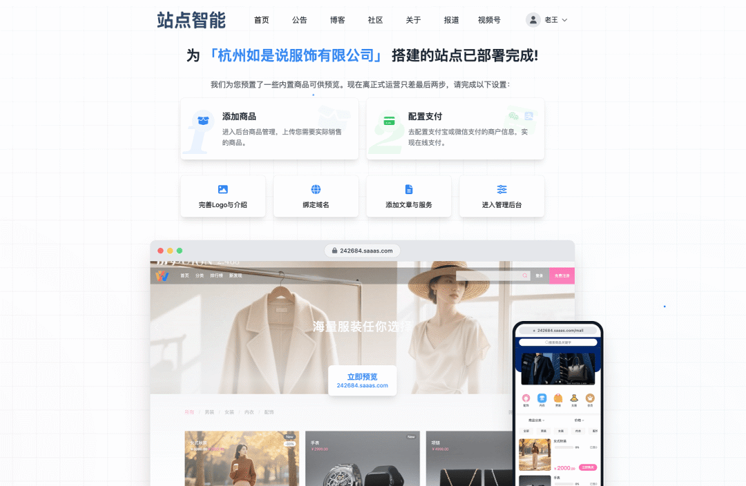 部署完成后,点击 “立即预览” 进入临时域名查看站点,支持个性化设置,分别检查 PC 端、移动端效果(可在浏览器切换 “桌面端 / 移动端” 模式);临时域名可用于内部测试、小范围推广,正式使用需绑定独立域名。