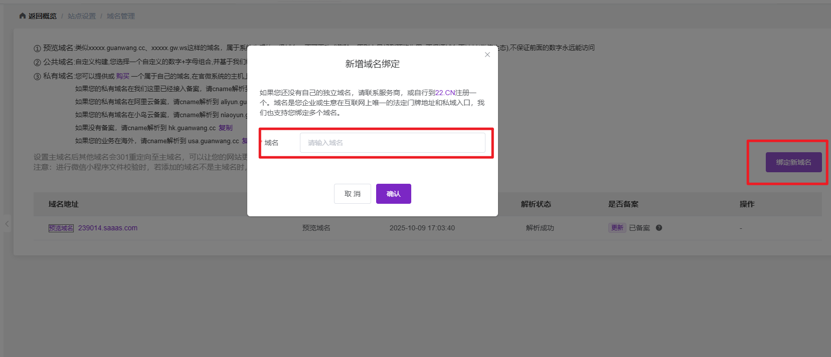 进入 “绑定域名” 模块,按提示完成域名解析(阿里云备案域名解析至 “aliyun.guanwang.cc”,海外业务解析至 “usa.guanwang.cc”),替换临时域名,提升品牌专业性(绑定自有域名无需额外收费,需自行购置域名);
