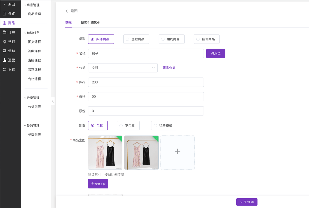 对于商城站点,进入 “管理后台→商品管理”,删除预置预览商品,点击 “新建” 上传实际销售商品,填写名称、分类(如 “女装→外套”)、库存、价格、上传 1:1 比例商品主图,选择 “包邮” 或配置运费模板;