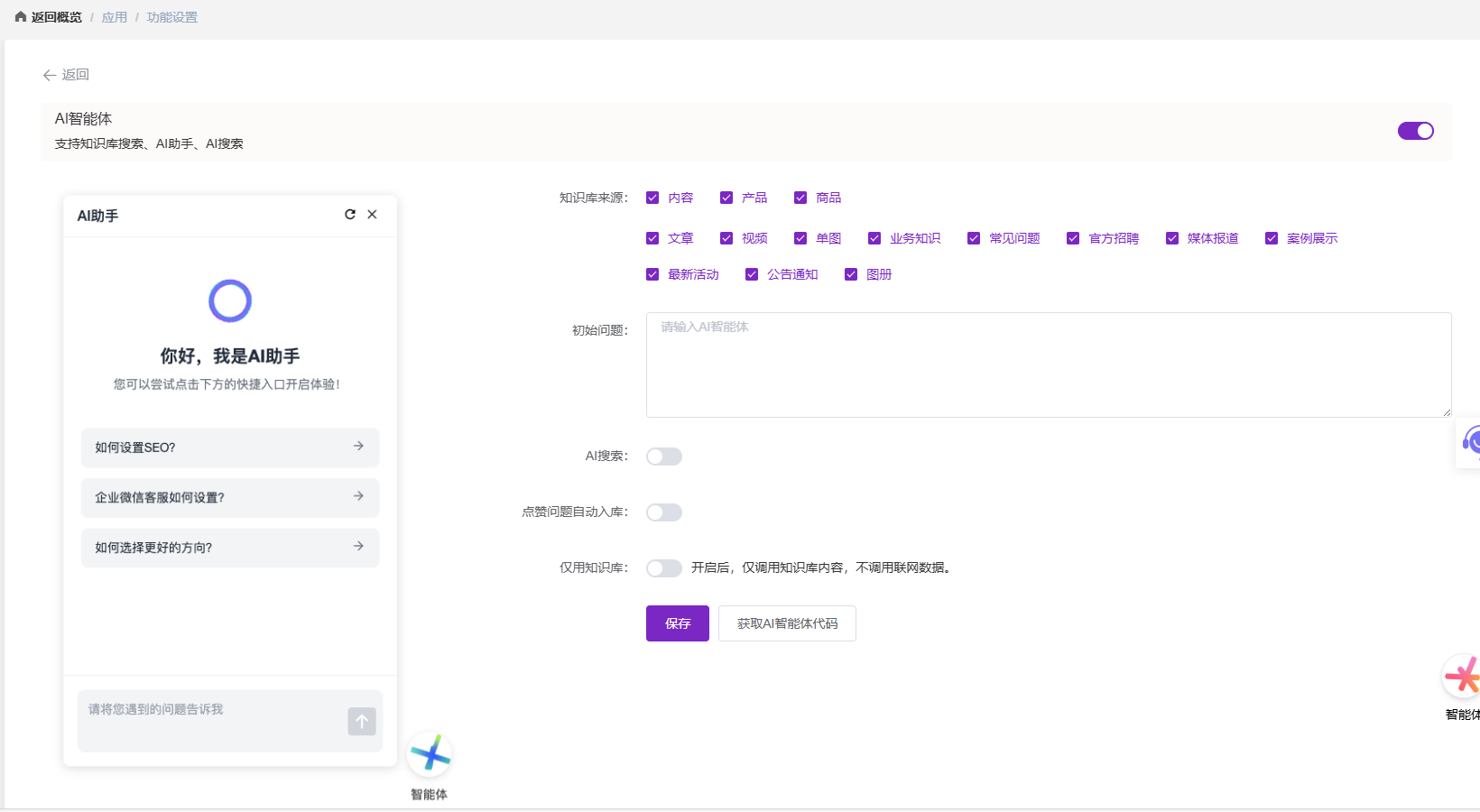 还可以开启智能体功能,进入 “管理后台→运营设置”,开启 AI 营销文案生成、实时客服响应功能,上传客服常见问题,系统将自动匹配客户咨询并回复。