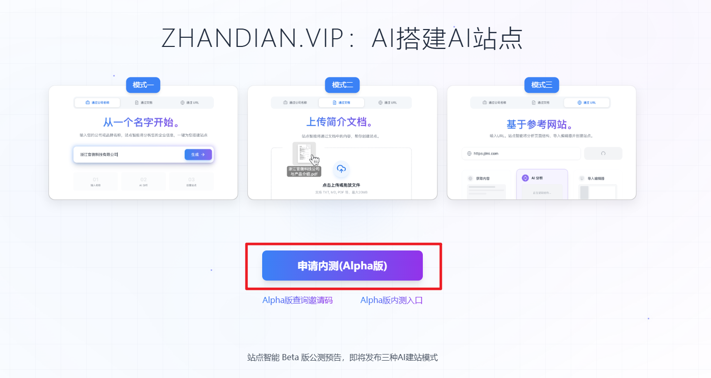 注意事项:若暂未获取邀请码,可登录站点智能官网(Zhandian.Vip)预约内测,官方将优先向预约用户发放邀请码。