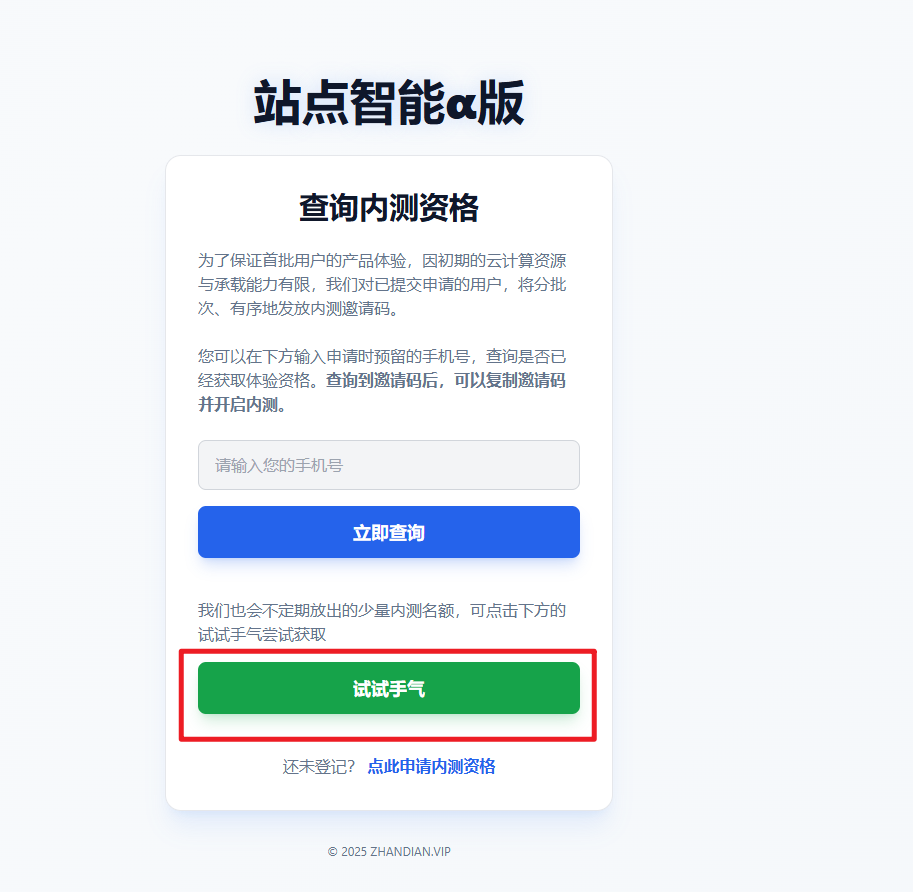 可以通过资格查询页面(zhandian.vip/a/yqm)看看自己是否获得资格,如果未获得资格,还能通过“试试手气”抽取邀请码:
