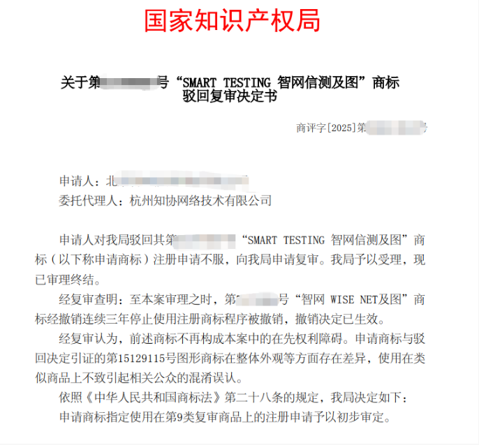 知协助力北京公司“智网信测及图”商标驳回复审成功