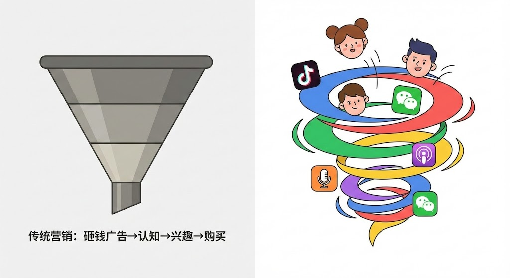 你可能早上在TikTok刷到一个小众品牌的搞笑视频,中午在朋友群里看到有人聊这个牌子,下午听播客时主持人刚好提到它,晚上刷朋友圈又看到有人晒单,一套组合拳下来,你可能没见过它的正经广告,却已经默默下单了。