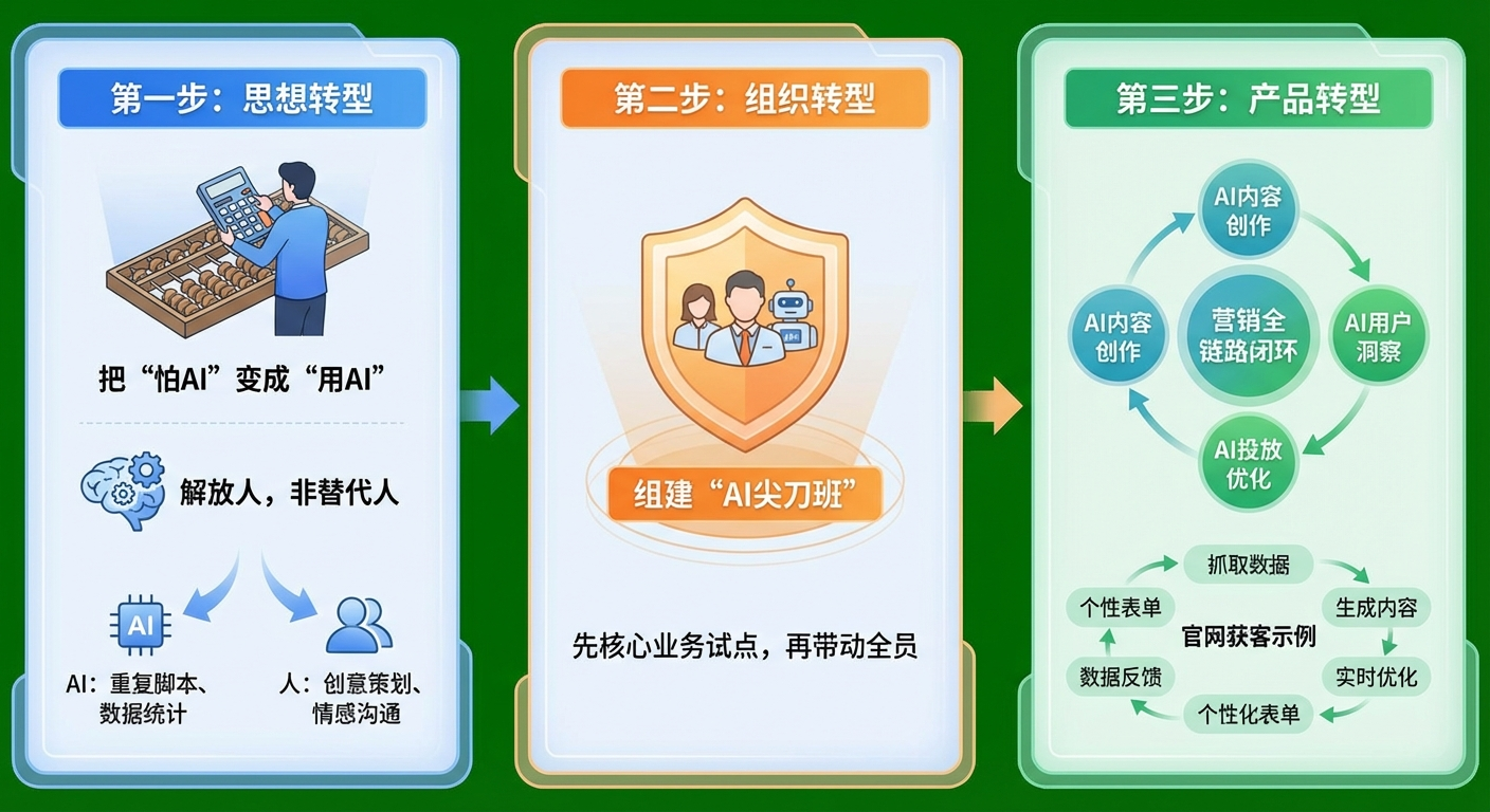 光有想法不够,得有专门的团队落地,对企业来说,不用一开始就全员铺开,先挑核心业务组建AI小组,比如内容团队配AI创作工具,投放团队用AI优化系统,让小团队先做出成果,再带动全员转型。
