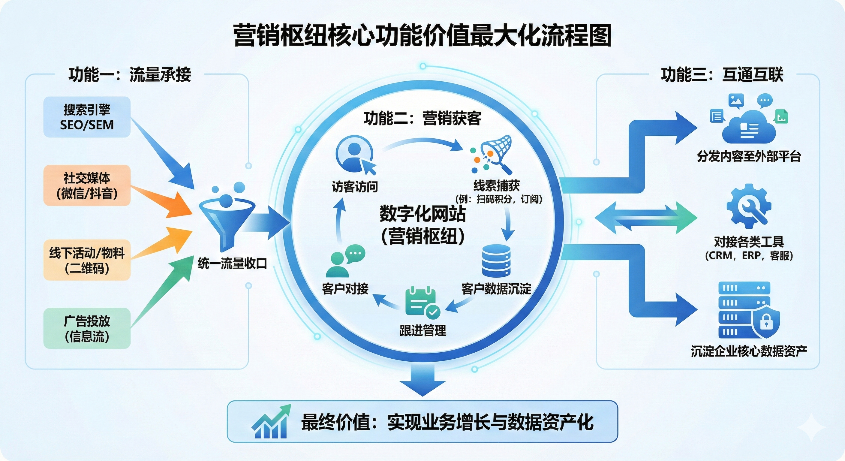 “以站为枢纽” 是系统的核心逻辑,简单说就是把升级后的数字化网站当成你企业数字化营销的 “核心枢纽”—— 它既是客户看到的品牌 “门面”,也是承接所有流量、让客户主动找到你的 “落客平台与大厅”,不管是公域引流、社交分享,还是客户主动搜索,最终都会汇聚到这个 “枢纽” 上,成为你营销获客的核心入口。