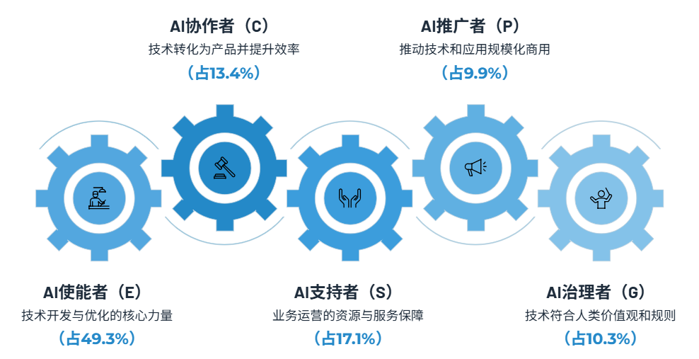 整体而言,AI对人类职业与劳动力影响呈现增强、替代、补充、创造四个效应。当前,新一代GenAI还处在不稳定的快速迭代演进中,四个效应虽然都在发生,但发展速度和幅度存在差异和错位,导致AI对就业的影响呈现较大的复杂性,主要体现在四方面:AI增强带来普遍性提效,替代必然发生。新技术的采用根本动力在提效,AI更是如此,并且将提效范围从体力劳动扩展到脑力劳动。由于新技术扩散呈现非均衡性,早期少数先锋群体会率先掌握,形成“掌握AI的人”相对“不掌握AI的人”效率明显提升,必然导致前者对后者的部分劳动力替代。高盛的研究显示,GenAI一旦全面采用并融入常规生产,将使美国等发达市场的劳动生产率提高约15%,可能导致失业率在AI转型期间比趋势水平上升半个百分点。国际劳工组织报告反映,全球有25%的就业岗位面临GenAI影响风险,高收入国家比例更高达34% 。AI替代短期快于创造,但替代不等于失业。AI应用尚处早期,替代效应快于创造效应。这种时滞不仅源于技术本身的快速迭代,更在于产业应用和人才培养的滞后。企业需要时间来调整组织结构和业务流程以适应AI,而教育体系和个人也需要时间来学习新技能、完成职业转型。尽管如此,替代并不等同于失业。据调研,当前企业并未因AI应用直接进行大规模裁员,而是普遍采取“停招、转岗、削减外包”三步走策略,缓解用工压力并实现成本优化。可见,AI引发的就业结构性变化,通过劳动力再培训等方式能够缓冲结构性失业风险。人力不足、招工难的岗位,AI补充价值高。针对人力不足、高危、高强度的工作而言,AI的人工替代能力反而能发挥劳动力补充作用,帮助解决“有活没人干”的结构性用工难题,这对于我国面临的老龄化人口挑战至关重要。线上工作像客服、电销、催收等岗位,工作单一枯燥且薪酬不高,很多年轻人并不愿做,企业难招聘长期稳定的员工,AI能有效补充劳动力。现场工作像高空作业、抢险救灾、工业生产等,往往存在工作环境危险、工作强度大等问题,采用现场AI和远程人工协作方式,能大幅降低安全风险。此外,对医疗、教育等优质资源分配不均的公共服务,AI服务能够帮助提高普惠性。AI创造全新岗位有滞后,老岗位+AI技能翻新是当下主流。AI正在重塑职业形态,但短期全新的职业增长有限,企业更倾向于在老岗位上叠加AI技能要求。某招聘平台2024年调研显示,明确要求AI工具技能的职位同比增长68%,但职位名称基本没变化,主要集中在数据、设计、文字类工作,如产品经理、算法工程师、平面设计等。全新职业尚未大规模涌现,原因在于职业相比技术发展速度会明显滞后,通常需要技术工具带来新任务,逐步发展稳定后才可能形成职业。探索AI新职业发展趋势,AI领先企业是最佳观察对象。综合分析美国OpenAI、Anthropic、DeepMind及我国DeepSeek、Kimi、智谱和通义等7家主流AI大模型厂商最近岗位开放招聘信息共718个(2025年9月15日),AI新职业可以大致分成使能者、协作者、治理者、推广者和支持者五大类,涵盖了AI生态中不同的价值创造链条:图1:AI五类核心职业及招聘岗位数量占比(7家AI公司统计)AI使能者(Enablers):AI生态的核心“造血”角色,直接负责开展AI技术的开发、运维与优化工作,是AI技术从理论走向应用的核心保障。典型岗位包括AI研究科学家、算法工程师、数据工程师、数据中心工程师、AI部署经理等。当前,AI使能者招聘岗位数量最多、最丰富(占比近50%),反映AI还处于技术快速迭代突破阶段,底层技术研发人才需求量大。新职业实例:前线部署工程师(FDE,OpenAI)
