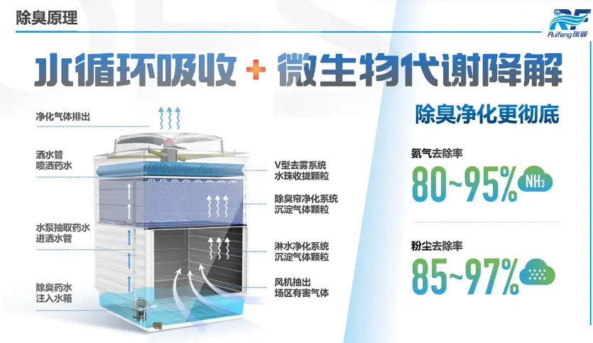 第二步,多层净化(淋水+除臭帘+去雾)去除90%以上致臭物质,实验数据显示,氨气经过净化后浓度从30mg/m³降至8mg/m³;