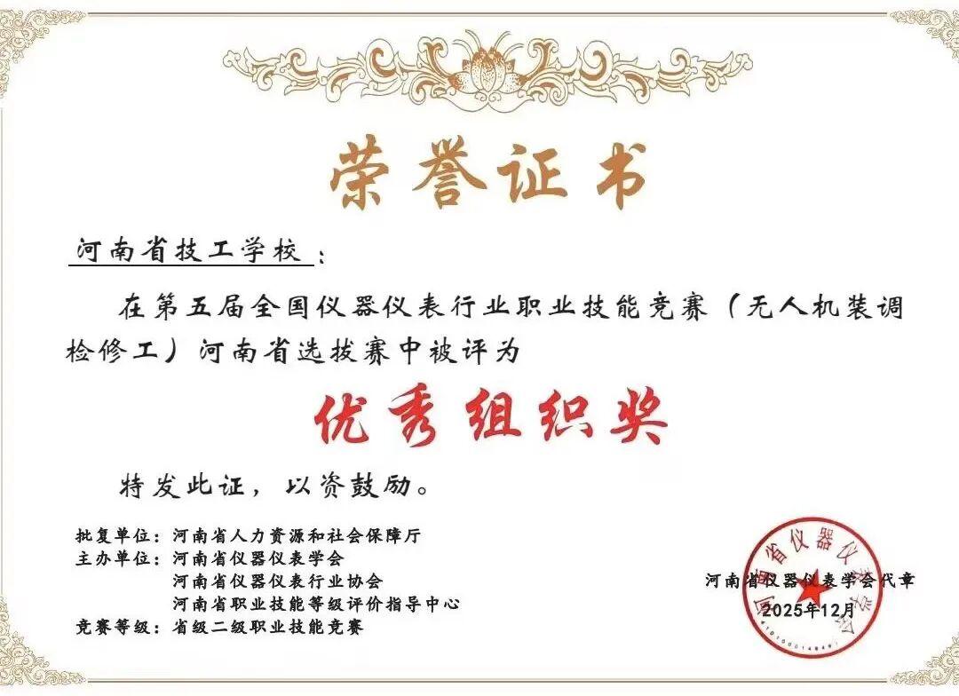 近日,第五届全国仪器仪表行业职业技能竞赛(无人机装调检修工)河南省选拔赛在河南机电职业学院落幕。我校25级无人机操作与维护专业刘政宇、杨雅竹同学,分别斩获学生组二等奖、三等奖,彰显学校无人机技术人才培养成效。