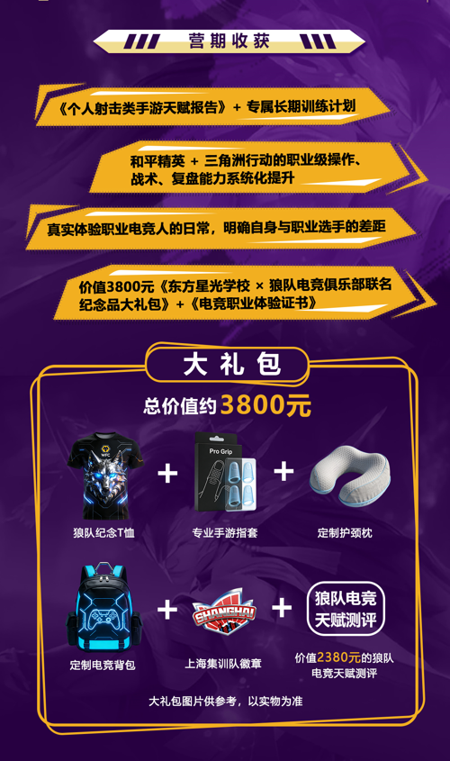 更有总价值约 3800 元的联名大礼包诚意相送:狼队纪念 T 恤、专业手游指套、定制护眼枕、定制电竞背包、上海集训队徽章,每一件装备都承载着电竞热爱与成长印记。额外附赠价值 280 元的狼队电竞天赋测评,让学员清晰认知自身优势与提升方向。