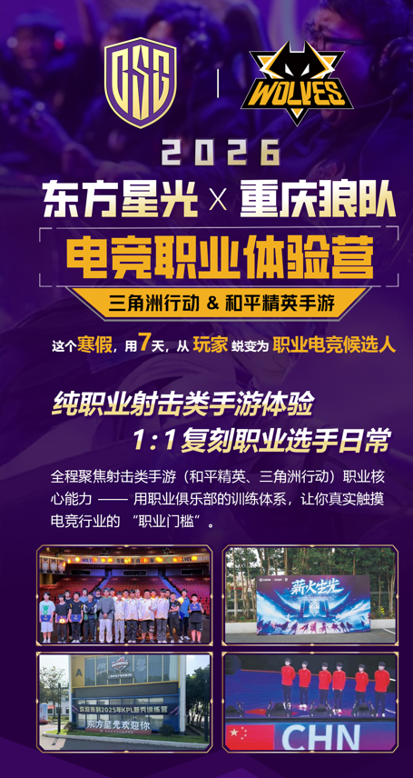电竞不是沉迷的借口,热爱更需专业的滋养。2026 东方星光 × 重庆狼队电竞职业体验营,让每一份电竞热爱都能找到正确的成长方向,让潜力在科学训练中绽放!