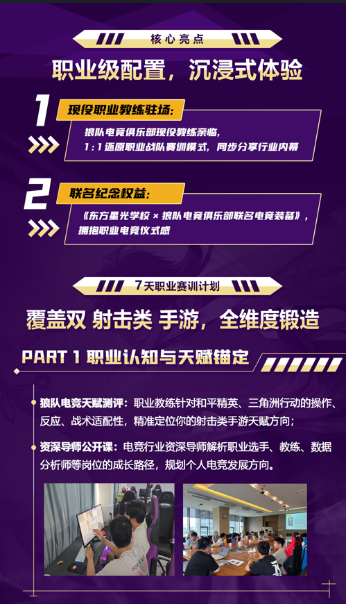 训练全程聚焦射击类手游核心技能,从基础操作到战术协作,从心理抗压到健康管理,全方位覆盖职业电竞所需的综合素养。更有《东方星光学校 × 狼队电竞俱乐部联名电竞装备》专属权益,让学员在训练中拥有专业装备加持,沉浸式感受电竞魅力。