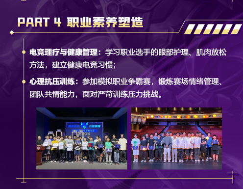 - 职业素养塑造:特别设置电竞理疗与健康管理课程,传授科学用眼、预防劳损的专业知识,同时开展心理抗压训练,培养学员面对胜负的良好心态,助力全面发展。