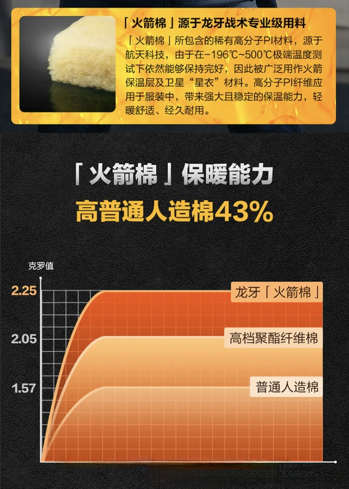 热湃PI絮片的导热系数低至0.03W/(m·K),接近静止空气导热水平,其隔热性能源于材料本身低导热特性与三维蓬松纤维结构的协同作用。通过特殊纺丝工艺形成的微米级纤维网络,可有效截留静止空气,阻断热传导与热对流通道;部分产品采用P84®三叶形截面纤维,进一步提升比表面积,强化隔热效果的同时优化透气性能。实验数据验证,119g/m²规格的热湃PI絮片保温率达81.5%,显著优于同克重羊绒(70.1%)及3M新雪丽涤纶絮片(64.9%);在极端环境测试中,可耐受-196℃液氮低温冲击与260℃长期高温工况,热阻克罗值稳定性误差≤5%,远超传统聚酯纤维材料的环境适应性极限。