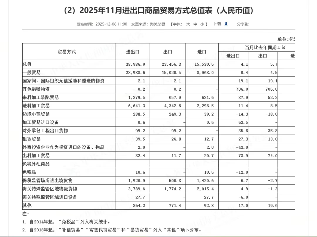 11月单月增速显著回升,进出口总值3.9万亿元,增长4.1%,其中出口2.35万亿元增长5.7%,进口1.55万亿元增长1.7%,为全年外贸稳健增长筑牢基础。