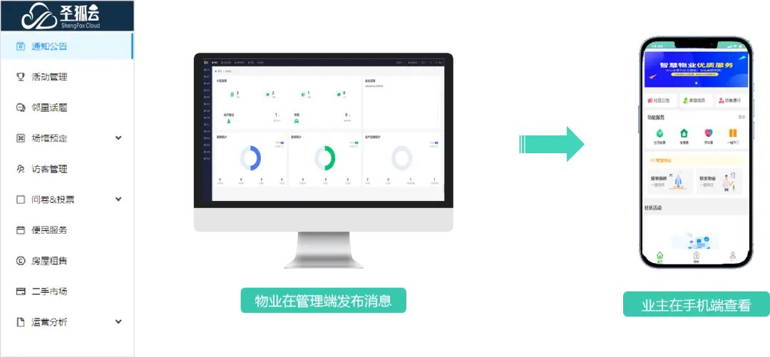 圣狐云支持桌面端、移动端(小程序/APP)、大屏看板多端同步接入,打通物业、业主、商户的沟通壁垒,实现信息实时流转与高效协同。