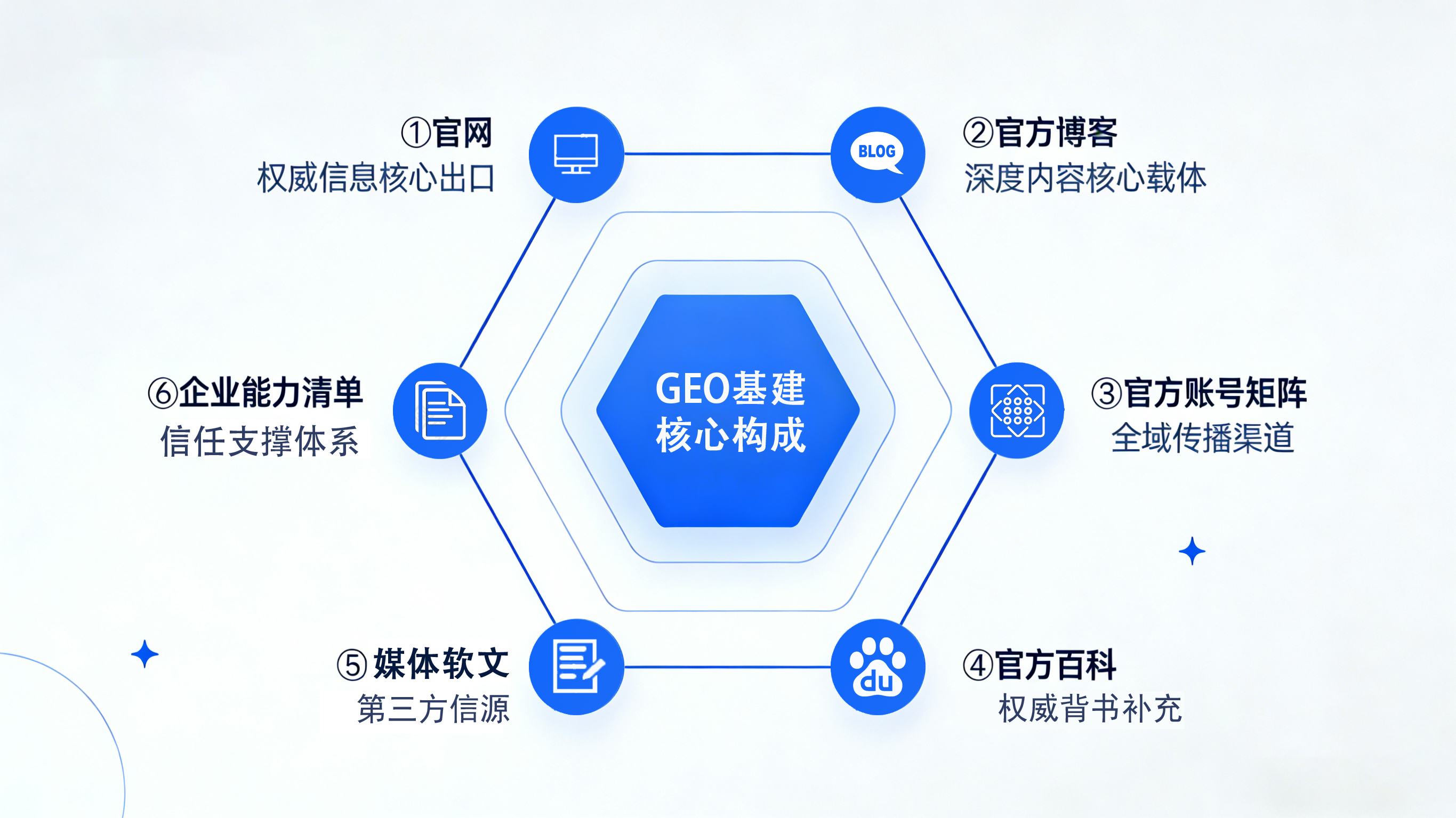 GEO 优化基建,是企业在互联网生态中构建的全维度权威信息矩阵,涵盖官网、官方博客、自媒体账号、官方百科、企业能力背书体系及第三方媒体信源等核心模块。其中,官网作为企业信息的 “官方中枢”,官方博客作为深度内容的 “传播载体”,二者共同构成 GEO 优化的核心支柱,直接决定了 AI 抓取可信度与用户决策效率。