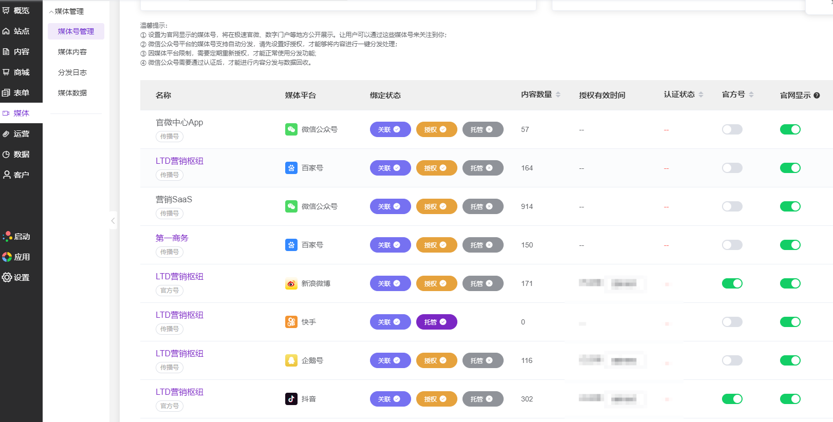 涵盖百家号、网易号、搜狐号、企鹅号、微信公众号等主流自媒体平台,是内容分发、用户触达的重要触角,需与官网、博客形成信息联动。