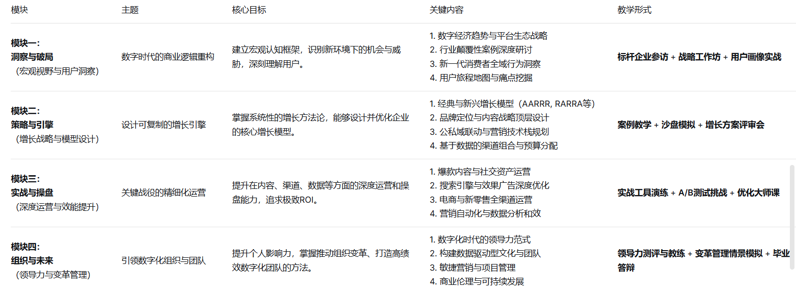 认证: 完成所有模块并通过答辩,授予结业证书。评选“最佳增长方案”、“卓越领导力”等奖项。