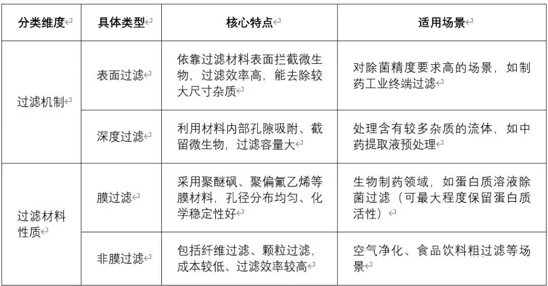 根据不同划分标准,除菌过滤工艺可分为多种类型,每种类型都有其适用场景,选择匹配的工艺才能保障过滤效果: