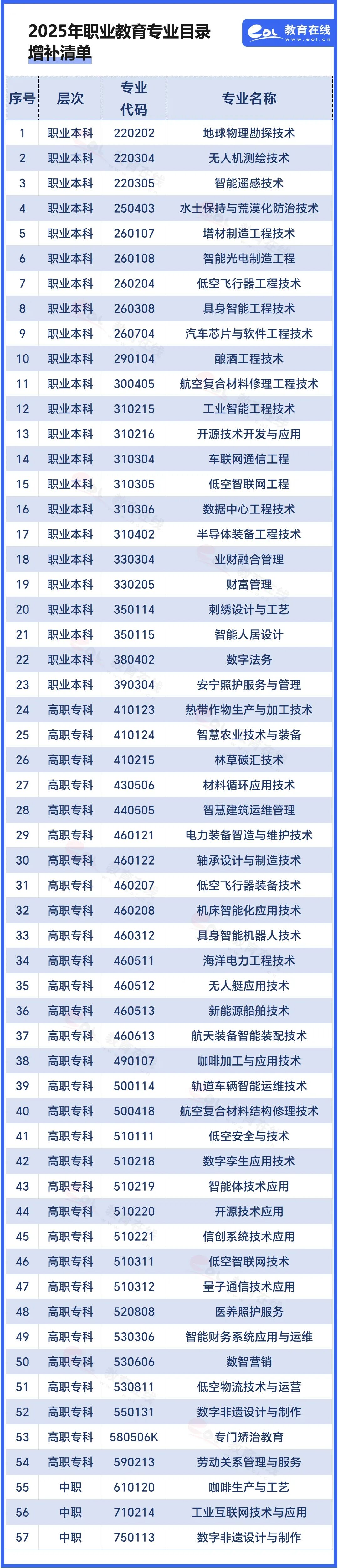 对比2024年12月更新版本,该目录共增设了57个新专业,涉及职业本科专业23个、高职专科专业31个、中职专业3个。