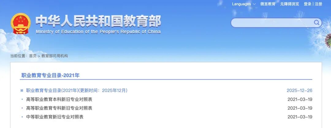 2025年12月26日,教育部官网更新《职业教育专业目录(2021年)》。