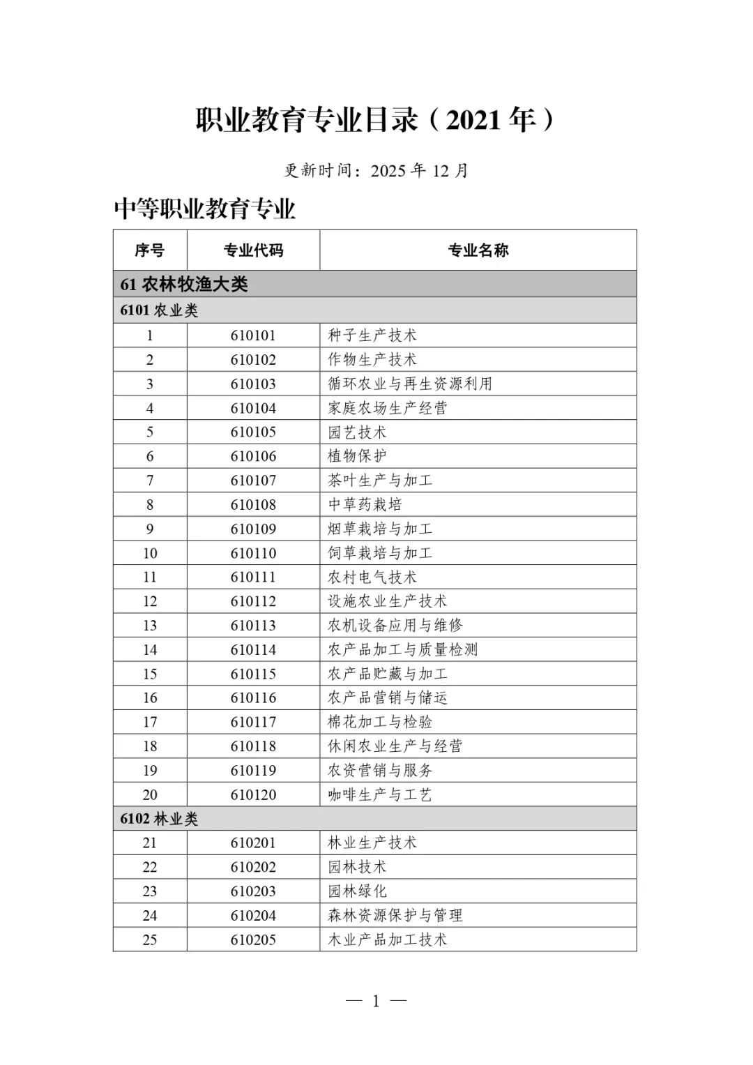 职业教育专业目录(2021年)(更新时间:2025年12月)详细名单如下: