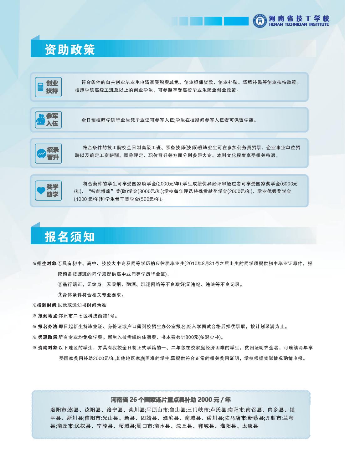 河南省人力资源和社会保障厅于2025年7月7日发布了《河南省技工院校2025年招生公告》。公告指出,技工院校招生对象广覆盖,凡遵守我国宪法、法律,身体状况符合所学专业需求的初中以上毕业生均可报名。公告详细说明了中级技工(学制3年)、高级技工(学制2-3年)和预备技师(学制2-4年)的学制安排,并特别强调了对国家乡村振兴重点帮扶县学生、脱贫家庭和防止返贫致贫监测对象家庭学生的优先政策,包括优先招生、优先选择专业、优先安排实习和就业等。后附河南省技工学校2025年招生简章: