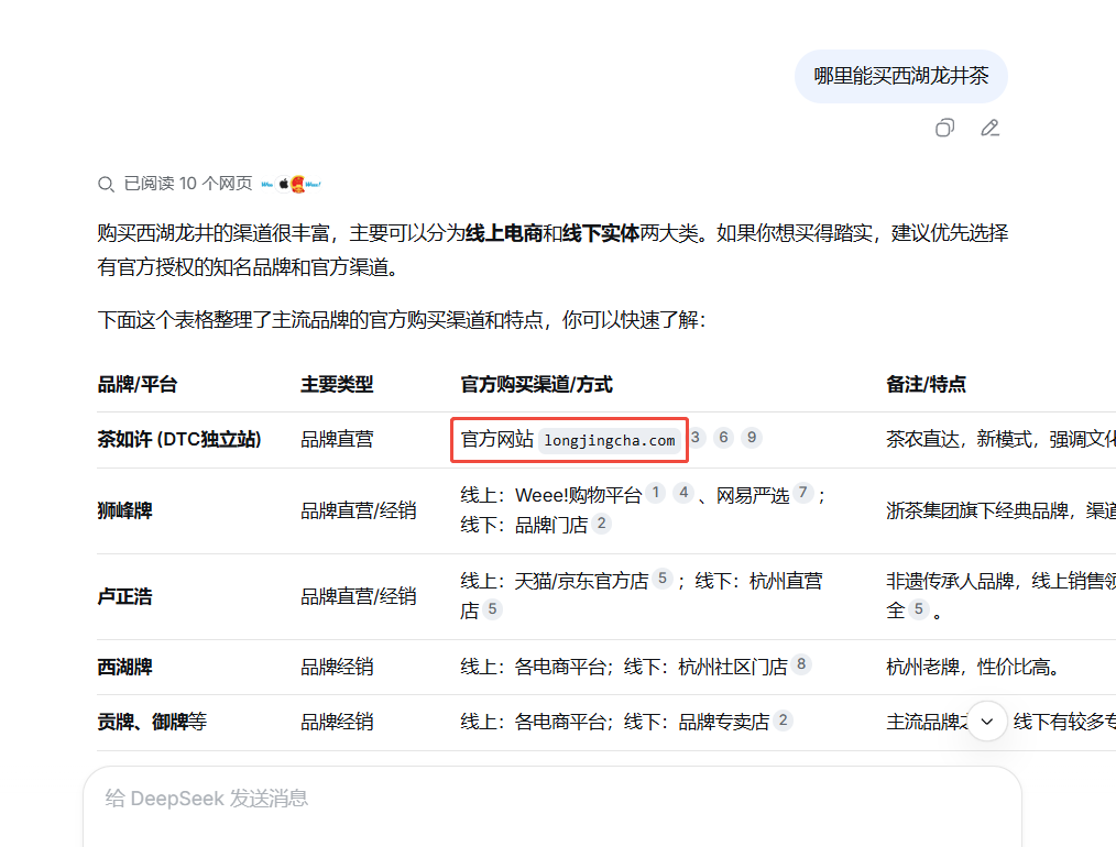 刚刚在DeepSeek输入“哪里能买西湖龙井茶”的问题,推荐的第一个居然是刚刚官网,即将要上线的 茶如许 longjingcha.com (西湖龙井茶DTC独立站)。可见在AI时代,好域名的标准依然是:人能识别,好记忆,输入简单。