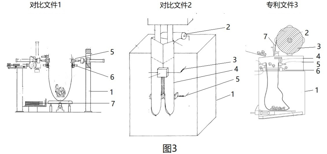 如下面图3所示,对比文件1涉及一种封袋机,其整体方案包括技术特征:封袋机本体1、装袋机构7、吸嘴组5和封袋机构6,其中所述装袋机构7存放有一个个单独的塑料袋;所述吸嘴组5包括第一吸嘴、第二吸嘴和第三吸嘴,所述第一吸嘴、第二吸嘴与所述第三吸嘴所面对的方向相反;封袋机构8,所述封袋机构装设有电热组件并位于所述吸嘴组的下方。工作时,吸嘴组5使用第一吸嘴和第二吸嘴吸住装袋机构7内的一个塑料袋并将塑料袋提升至一定高度后,吸嘴组旋转,然后用第三吸嘴使得塑料袋口部张开后装填物料,最后再用封袋机构6进行热密封。