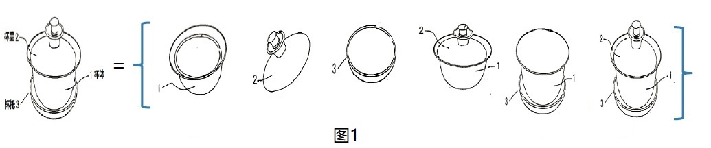 为判断发明是否具备新颖性和创造性等专利授权条件所引用的相关文件通称为对比文件。技术特征是能够相对独立地执行一定的技术功能、并能产生相对独立的技术效果的最小技术单元。技术方案是由一个或多个技术特征组成的技术特征集合。一个对比文件中通常记载多个(例如M个)技术特征,这些技术特征通常又可以组合为多个(例如N个)技术方案。如下图1所示,对比文件记载一种整体的茶杯,其包括三个技术特征,即杯体1,杯盖 2和杯托3。这些技术特征可以被组合为至少如下六种技术方案。这些方案都可以作为现有技术来评价专利的新颖性和创造性。