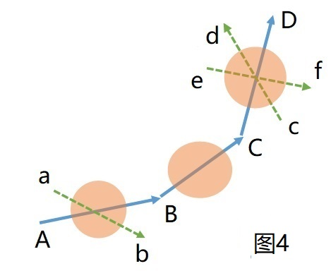 如下面图4所示,假定技术手段的作用是产生一定位移,其中技术手段1客观所能产生的位移是向量AB和向量ab,技术手段2 客观所能产生的位移是向量BC,技术手段3客观上所能产生的位移是向量CD、向量cd和向量ef。但在技术手段1-3所组成的技术方案中,技术手段1实际产生位移是向量AB,技术手段2实际产生的位移是向量BC,技术手段3实际产生的位移是向量CD。
