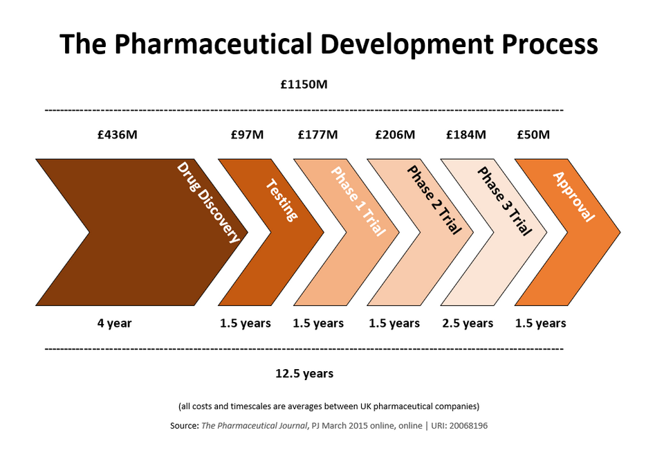 (上图为典型的药物研发流程图,展示了从发现到上市的阶段和成功率递减。)