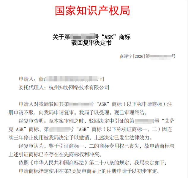 知协:撤销两个引证商标,“ASK”商标驳回复审成功