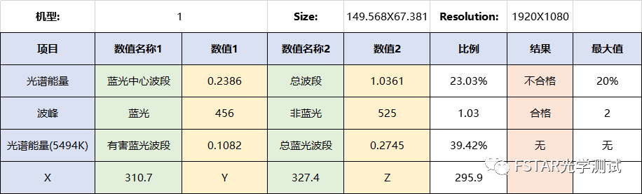 弗士达公司按照TUV低蓝光检测标准,基于硬件及软件的检测方法,对2组产品进行测量,测试数据如下: