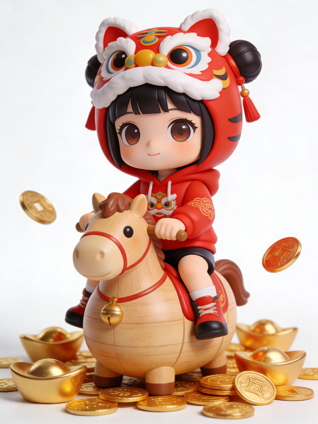 你的照片将瞬间变身价值隐藏款的“3D盲盒公仔”,骑着可爱小木马,身边堆满金元宝。质感像陶瓷一样温润,超级适合做微信头像或者定制红包封面!