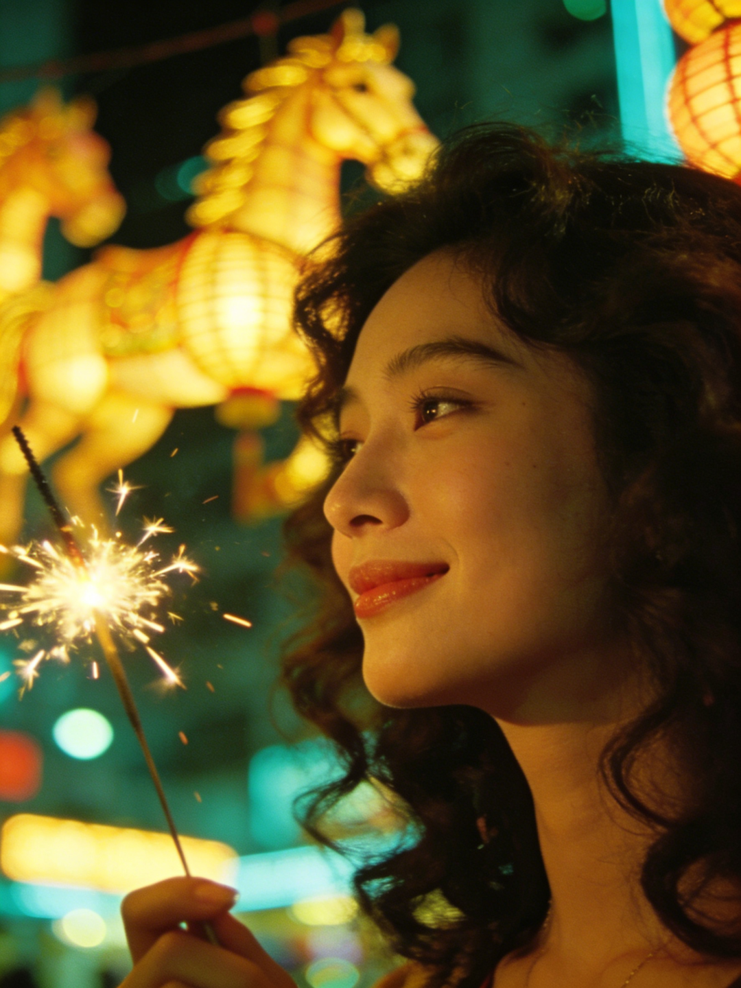 模糊的走马灯光影,温暖的烟花棒,虚实结合的金色骏马雕塑。这张照片就像电影截图一样,写满了故事感。