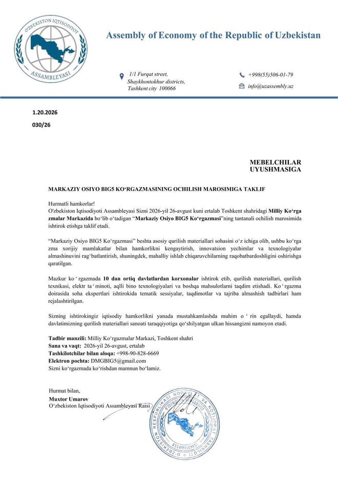由乌兹别克斯坦建设部、交通部、地质和矿产资源部、经济部、能源部等五大核心部委,联合国际知名展会运营机构DMG集团重磅打造的中亚五大行业展会(BIG5),正式对外官宣,将于2026年8月26日至28日在塔什干国际会展中心举办。