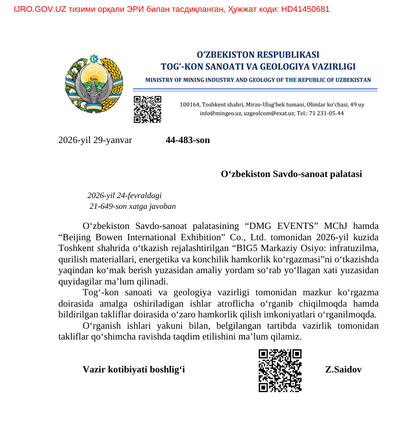 政企联动,盛启新章!乌兹五大部委携手DMG集团,2026中亚BIG5五大行业展会,启幕丝路合作新征程