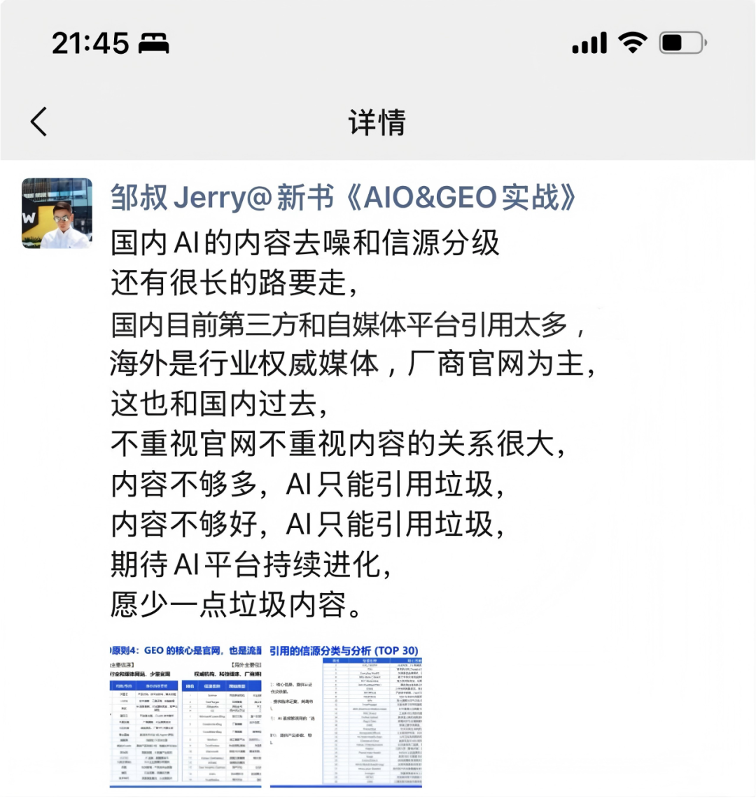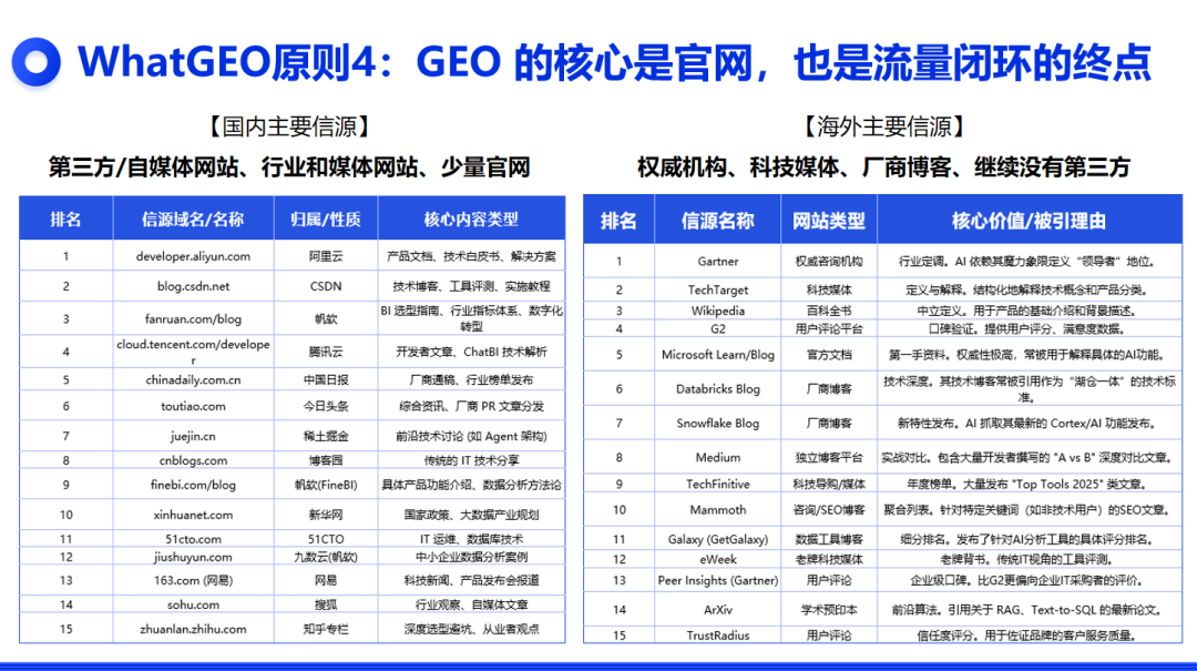上面说的都是表象,真正的根子,在于我们国内互联网的生态本身,就有大问题。一句话:国内AI的内容去噪和信源分级,还有十万八千里的路要走。咱们跟海外的互联网生态,有个根本性的不同。在海外,信息源是有相对清晰的“鄙视链”或者说“金字塔”的。海外AI的“食谱”相对干净:Google这类搜索引擎,会极度看重“信源”的权威性。排在最顶端的,永远是那么几类:顶级媒体(纽约时报、BBC)、顶级学术期刊(Nature)、政府和教育机构(.gov, .edu后缀),以及一个至关重要的东西厂商的官方网站。官网被认为是这个品牌信息的“第一发布源”,权重极高。所以AI学习的时候,能轻易分出三六九等,优先学习“好学生”的内容。这里要注意,不同于国内各种黑帽手法做的官网,在海外,如果一个企业的官网发布各种虚假内容和胡编乱造,很容易被降权或者被K掉,而国内则不太存在。国内AI的“食谱”是“大杂烩”:再看我们国内,这个“信源金字塔”是塌的。一个小编用AI写的百家号文章,在搜索结果里的权重,可能比一个世界500强企业的官网还高。各种B2B平台、自媒体、论坛、转载站……信息源极度分散且混乱。AI看花了眼,分不清谁是爹谁是妈,谁说的是真话谁在吹牛。过去十几年,中国企业普遍不重视自己的“根据地”官方网站和自有内容建设。官网做得像个20年前的电子名片,一年不更新。公众号要么是僵尸,要么就是个发公司新闻的“内部公告栏”。企业自己不生产优质内容,AI想学好的没得学;网上全是营销号和“GEO”制造的垃圾内容,AI只能被迫“吃垃圾”。“垃圾进,垃圾出”(Garbage In, Garbage Out),这是计算机科学第一课的道理。我们亲手喂给AI一堆垃圾,然后反过来骂AI怎么这么蠢,只会推荐垃圾?这不滑稽吗?第四层:平台的“失职”,本该是裁判,却干起了卖哨子的生意