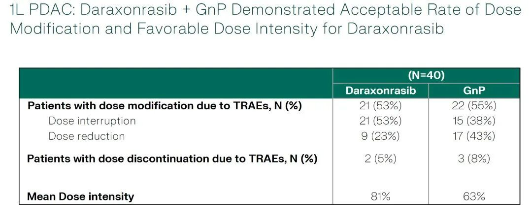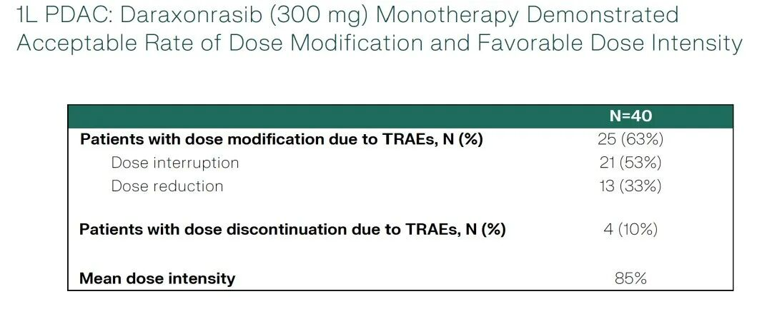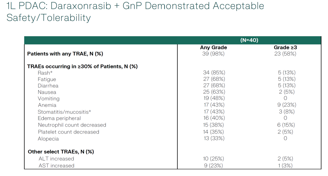 首先,在安全性方面,在83名RAS突变PDAC患者中,daraxonrasib 300毫克每日一次(QD)耐受性良好,其安全性与先前报告的数据一致,未发现新的安全信号。