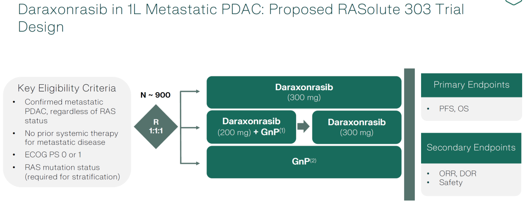 RASolute 303 是 一项全球性、随机、三臂的 3 期注册临床试验,旨在评估 daraxonrasib 单药治疗以及 daraxonrasib 联合吉西他滨和白蛋白结合型紫杉醇(GnP)在一线转移性胰腺导管腺癌(PDAC)患者中的疗效和安全性。